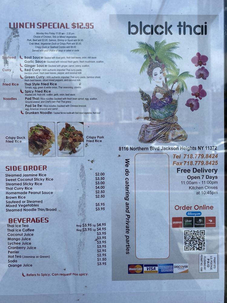 Welcome to Black Thai, a charming culinary gem nestled in Jackson Heights, NY, where authentic Thai flavors come alive. This vibrant establishment offers a cozy and intimate dining experience, ideal for family gatherings or casual outings. The menu is a delightful fiesta of options, including standouts like Shrimp Pad Thai and Crab Fried Rice, celebrated for their generous portions and rich flavors. Don't miss their signature Red Curry, perfectly blending spices that tantalize the taste buds. For dessert, the Mango with Sticky Rice is a must-try, embodying the essence of Thai sweetness. Accessibility is a key feature, with vegan options, outdoor seating, and even facilities for pets. Customers rave about the attentive service and vibrant ambiance, making each visit memorable. Whether dining in or taking out, Black Thai promises a flavorful journey that leaves you craving more.